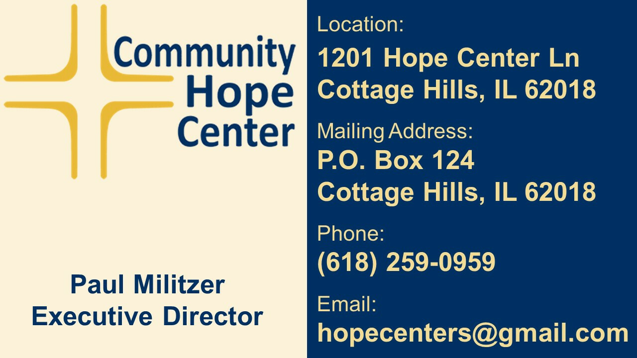 A group of us from the church will be going to the Community Hope Center to tour the facility and volunteer in any way we can from 10-12pm.